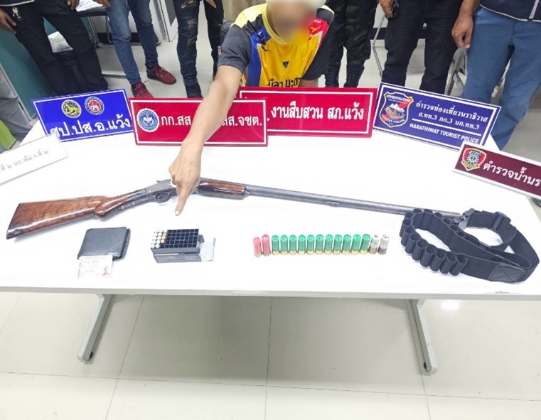 เมื่อวันที่ 10 พฤศจิกายน 2567 เวลา 20.00 น. พ.ต.ท.ประยูร สุวรรณโณ สว.สส.สภ.แว้ง พร้อมชุดสืบสวน สภ.แว้ง ได้ร่วมจับกุมตัว นาดำฯ (นามสมมุติ) อายุ 41 ปี พร้อมด้วยของกลาง อาวุธปืนลูกซองยาวลำกล้องเดี่ยวแบบหักลำ มีตัวอักษร ป.สามย่านพานิช เลขทะเบียนปืน กท 137701 จำนวน 1 กระบอก โดยกล่าวหาว่า “มีอาวุธปืนและเครื่องกระสุนปืนของผู้อื่นไว้ในครอบครองโดยไม่ได้รับอนุญาต และเสพยาเสพติดให้โทษประเภท 1(เมทแอมเฟตามีน) โดยผิดกฎหมาย”