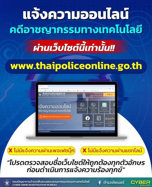 หากประชาชนตกเป็นเหยื่อโจรออนไลน์ สามารถแจ้งความผ่านระบบออนไลน์ (เฉพาะคดีอาชญากรรมทางเทคโนโลยี) ที่เว็บไซต์นี้เท่านั้น www.thaipoliceonline.go.th