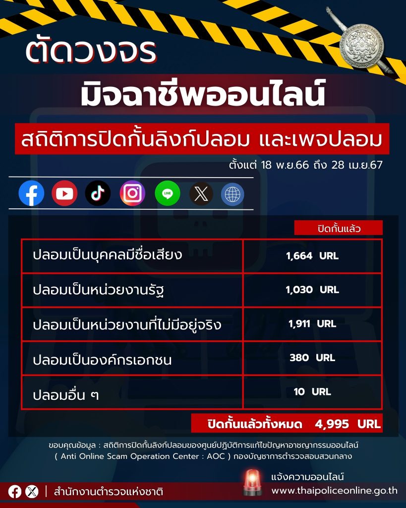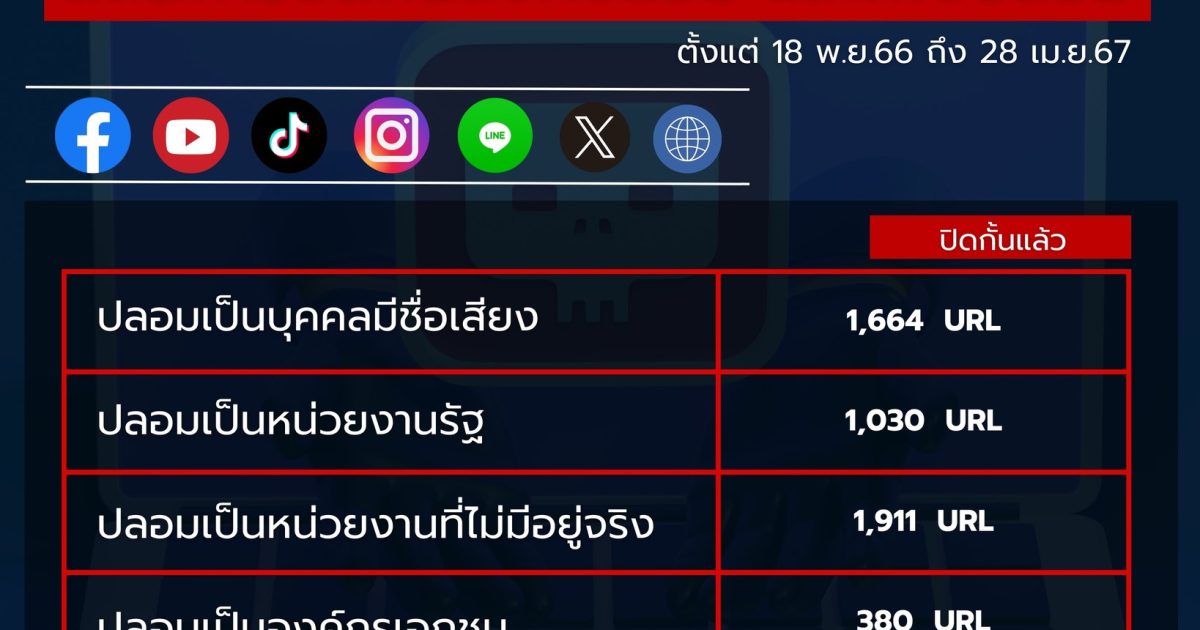 ทั้งนี้ตั้งแต่ 18 พฤศจิกายน 2566 ถึง 28 เมษายน 2567 ปิดกั้นลิงก์ปลอมไปแล้วทั้งหมด 4,995 URL