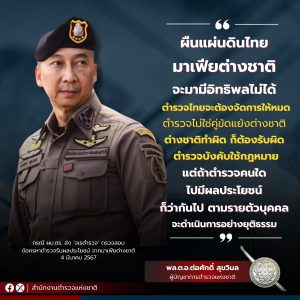 “ผืนแผ่นดินไทย มาเฟียต่างชาติจะมามีอิทธิพลไม่ได้ ตำรวจไทยจะต้องจัดการให้หมด ตำรวจไม่ใช่คู่ขัดแย้งต่างชาติ ต่างชาติทำผิด ก็ต้องรับผิด ตำรวจบังคับใช้กฎหมาย แต่ถ้าตำรวจคนใด ไปมีผลประโยชน์ ก็ว่ากันไป ตามรายตัวบุคคล จะดำเนินการอย่างยุติธรรม”