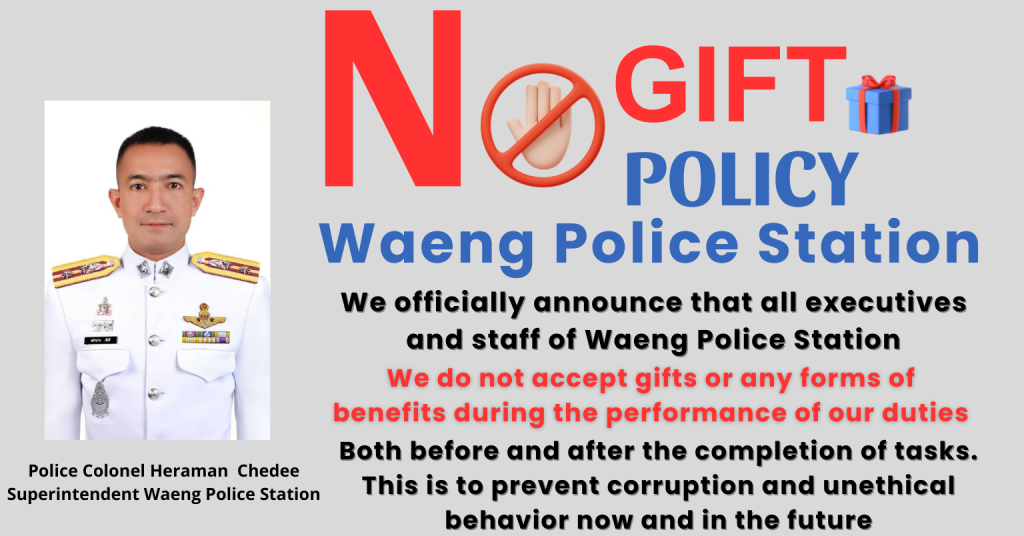 พ.ต.อ.เฮรามาน เจ๊ะดี ผกก.สภ.แว้ง, ร.ต.อ.หญิง มูนิง แวบือซา ปรก.รอง สว.ธร.สภ.แว้ง พร้อมด้วยข้าราชการตำรวจ สภ.แว้ง ร่วมประกาศนโยบายการต่อต้านการรับสินบน (Anti-Bribery Policy) และการไม่รับของขวัญ ของกำนัล หรือประโยชน์อื่นใด (No Gift Policy) จากการปฏิบัติหน้าที่ ประจำปีงบประมาณ 2568 ณ หน้าที่ทำการ สถานีตำรวจภูธรแว้ง จว.นราธิวาส