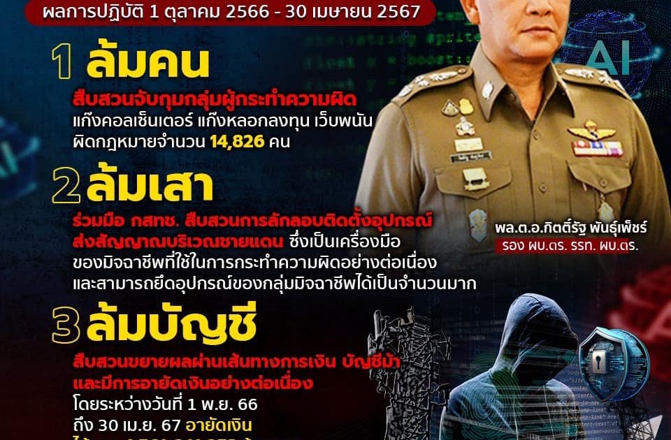 พล.ต.ต.ศิริวัฒน์ ดีพอ รองโฆษกสำนักงานตำรวจแห่งชาติ กล่าวว่า ตามนโยบายของ นายเศรษฐา ทวีสิน นายกรัฐมนตรี และ พล.ต.อ.กิตติ์รัฐ พันธุ์เพ็ชร์ รองผู้บัญชาการตำรวจแห่งชาติ รักษาราชการแทนผู้บัญชาการตำรวจแห่งชาติ (รอง ผบ.ตร.รรท.ผบ.ตร.) ให้สำนักงานตำรวจแห่งชาติดำเนินการสืบสวนปราบปรามอาชญากรรมทางเทคโนโลยีอย่างเข้มข้นนั้น