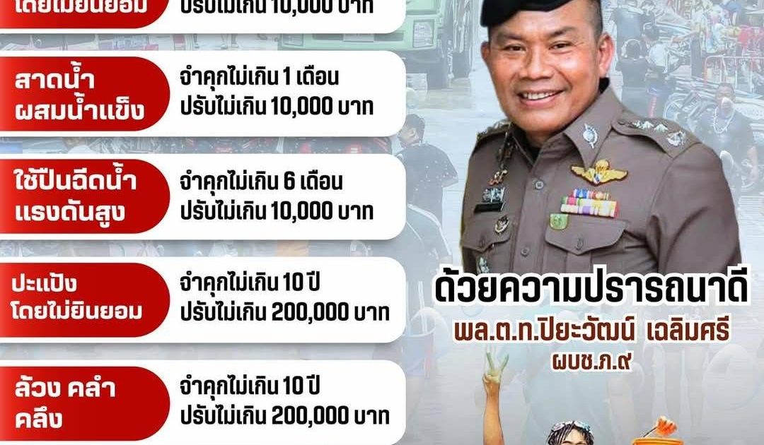 ร่วมสืบสานวัฒนธรรมประเพณีไทยอย่างสร้างสรรค์และถูกกฎหมาย ตำรวจภูธรภาค 9 จึงขอประชาสัมพันธ์ลักษณะการเล่นน้ำสงกรานต์ที่ผิดกฎหมาย ซึ่งมีโทษทั้งจำคุกและปรับ มีลักษณะใดบ้างมาดูกัน![]()